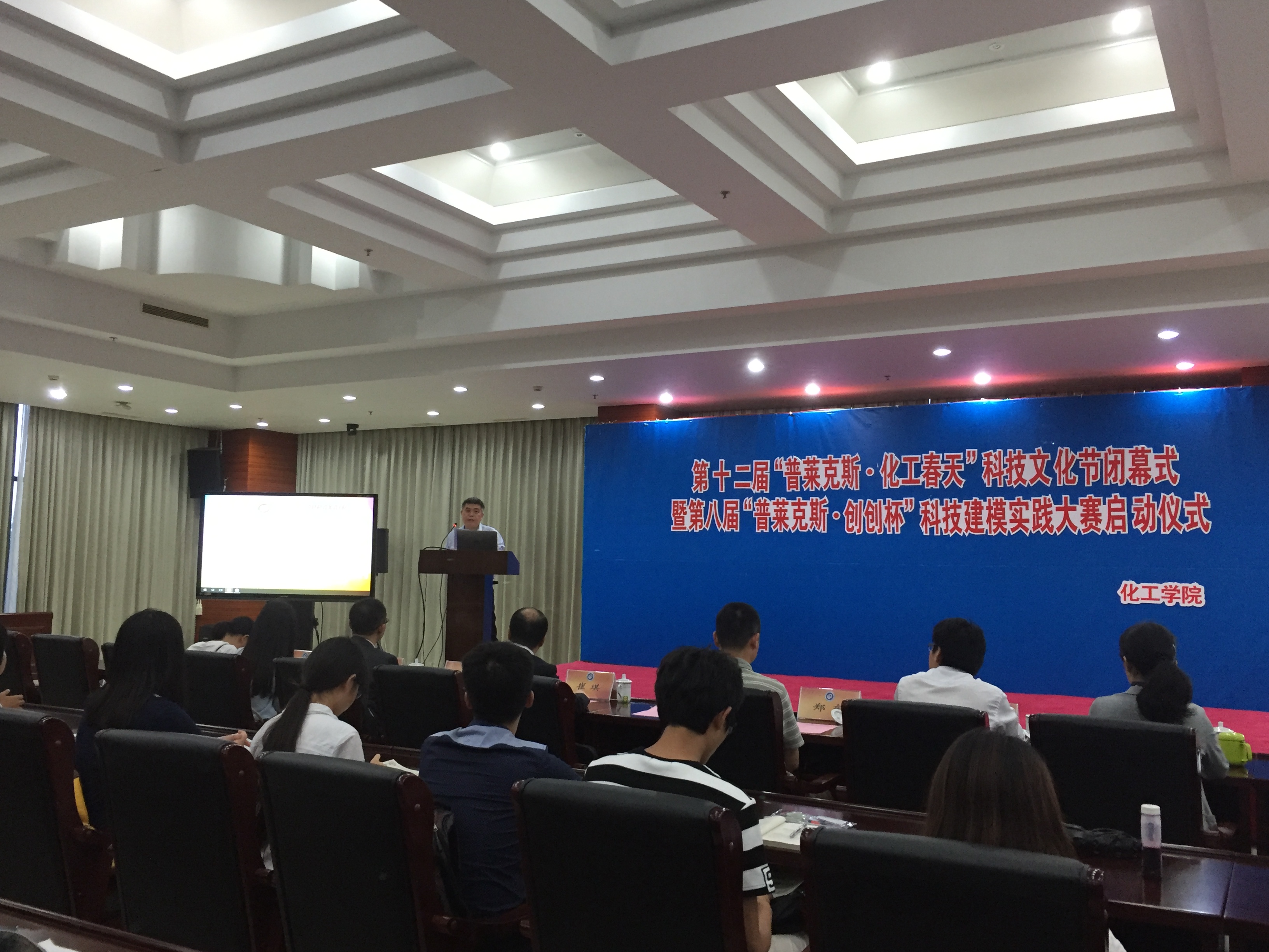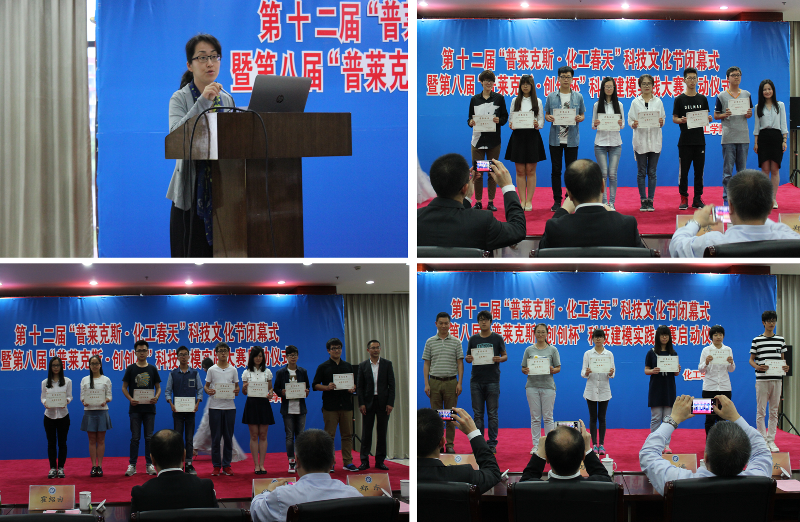 第十二届“普莱克斯•化工春天”科技文化节闭幕式暨第八届“普莱克斯•创创杯”科技建模实践大赛启动仪式,在奉贤校区图文信息中心通海厅举行。我校校友、普莱克斯(中国)公司亚洲工程技术中心副总监崔琪,中国区运营部黑带大师霍绍由、中国区人力资源专员钱雯婧,我校颜射合集