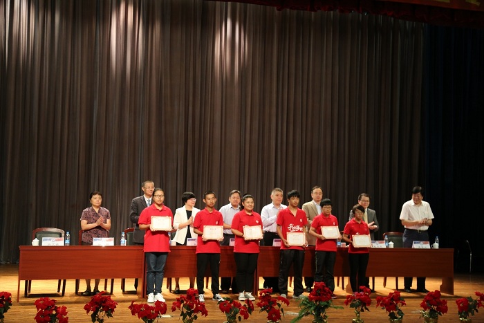 党委书记李涛教授宣读了《关于颜射合集颁发“共育化工菁英助学金”的决定》,并颁发了证书。身着“爱校服“的14名化工新生从各位教授手中接过证书。