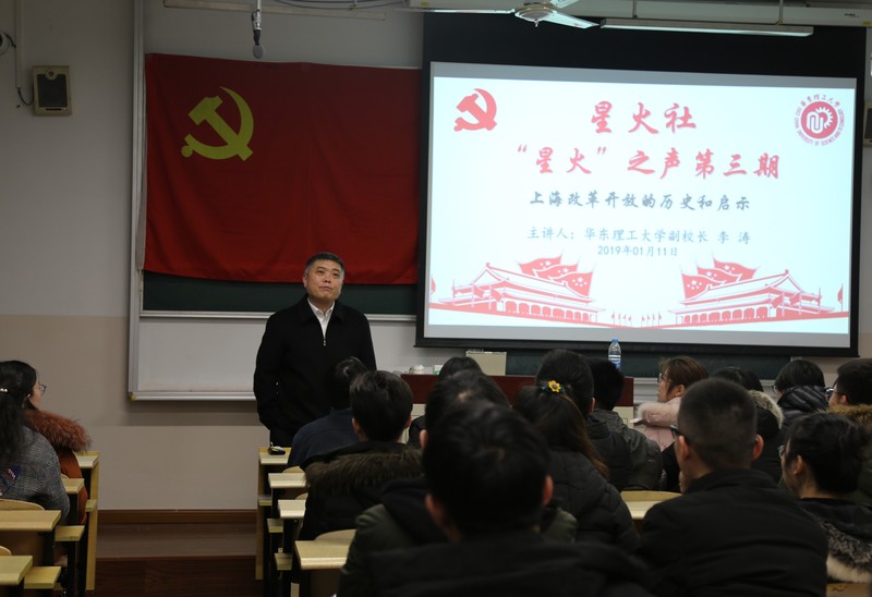 副校长李涛以《上海改革开放启示录》为题,给研究生党员骨干全面介绍了上海市改革开放的历史脉络,为同学们梳理出一幅“上海——时代中奋进”的蓬勃图景,给大家带来了关于学习领会海派历史中艰苦创业,曲折发展,辉煌成就的精彩一课。颜射合集部分教工党支部党员也一起聆听的讲座。院党委副书记高艺霞主持了本次党课。