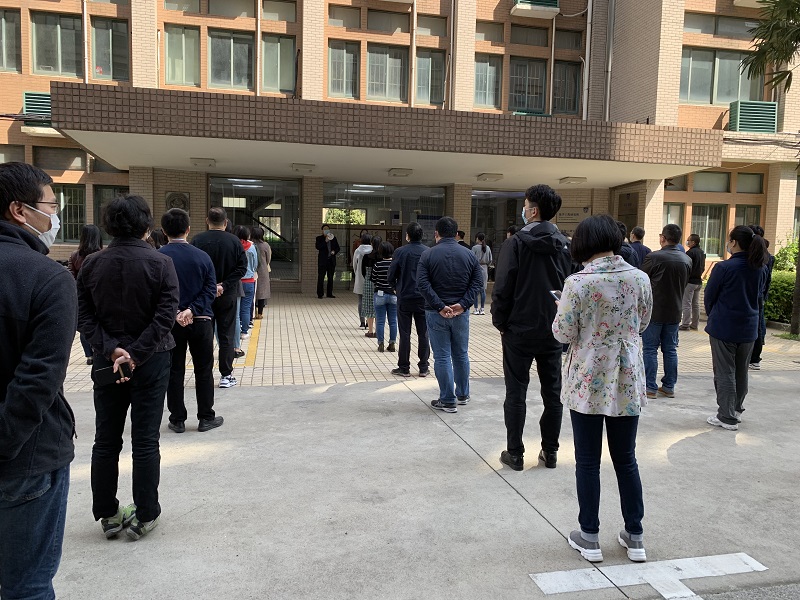 本次演练的主要内容是测温环节和现场模拟食堂购餐情况。演练人员在第一食堂外排队间隔1米进行体温监测后依次进入食堂通过楼梯走上三楼。食堂设置有进出专用定向通道,单进单出,由工作人员在取餐通道前维持秩序,分批放行,控制食堂内人数,取餐后有序退出食堂。饮食服务中心主任裴文波全面介绍了食堂的准备情况,环境进行严格消杀,把控原材料和制作过程,疫情期间食堂以打包方式为主,提供ABC三种套餐,套餐菜单两周不重样。