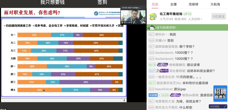 毕业生签约薪资却逆势提升。同时,盖钧超分享了自己多年来在就业工作中积累总结的对于职业发展、面试技巧等方面的宝贵经验。直播间气氛热烈,同学们纷纷表示受益匪浅。