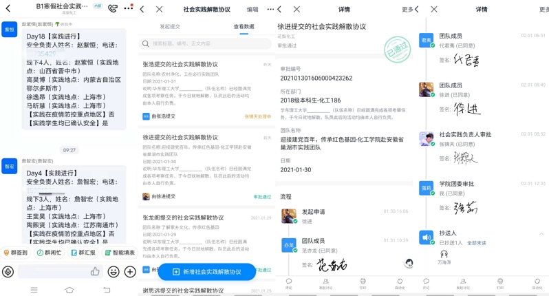 全程跟踪细管理,加强实践保障力。由于参与实践学生人数多、地域范围广,为做好疫情防控下的实践团队精准管理,加强动态跟踪及支持保障工作,颜射合集在“花梨化工”钉钉建立13个实践专项工作组,10个实践项目编为一组,根据疫情实时变化,做好各团队实践日报及健康管理工作,实践台账清晰明确。此外,还进一步完善“线上实践解散协议”,方便多地及线上实践团队及时完成解散报备,提升了实践组织的工作效率和无纸化水平。
