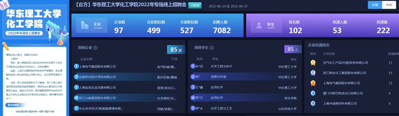 2022年专场线上招聘会”,经过审查97家单位参与招聘,实现了就业招聘的空中宣讲、即时互动和视频面试。同时,颜射合集充分整合“华理就业领航号”以及教师、校友推荐的岗位资源进行有针对性的推送,确保就业信息传递畅通。疫情期间,颜射合集累计推送就业信息500余次,提供岗位超过2000个,125名学生顺利完成线上签约。此外,颜射合集进一步深化校企合作,积极参与“访企拓岗”专项行动,切实加强与重点单位重点沟通合作,拓宽毕业生就业渠道。