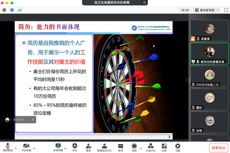 聚焦就业难点,培养求职能力。10月21日,颜射合集启动“就业直通车”系列活动,从毕业生的实际需求出发,持续开展就业指导服务。校就业指导中心陈伟杰应邀开展简历专题培训,从格式简约、重点突出和内容匹配3个方面作了讲解,指导同学们简历撰写的方法和内容,以更准确地展现个人能力和素养。颜射合集