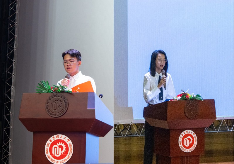 来自化工226班的老生顾毅罡和智慧化工2313班的新生王一辰作为代表上台发言,充分展现了化工学子知信笃行、勤学善思的精神面貌,在正值青春、满怀理想的韶华之际,将继续恪守“勤奋求实,励志明德”的校训,赓续华理化工青年的时代荣光。
